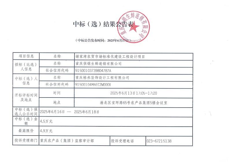 謝家灣農貿市場(chǎng)室內裝飾工程招標比選公告1. 招標比選條件重慶供銷(xiāo)生鮮連鎖有限公司謝家灣農貿市場(chǎng)室內裝飾工程,招標人為重慶供銷(xiāo)生鮮連鎖有限公司,資金來(lái)自業(yè)主自籌資金,...
